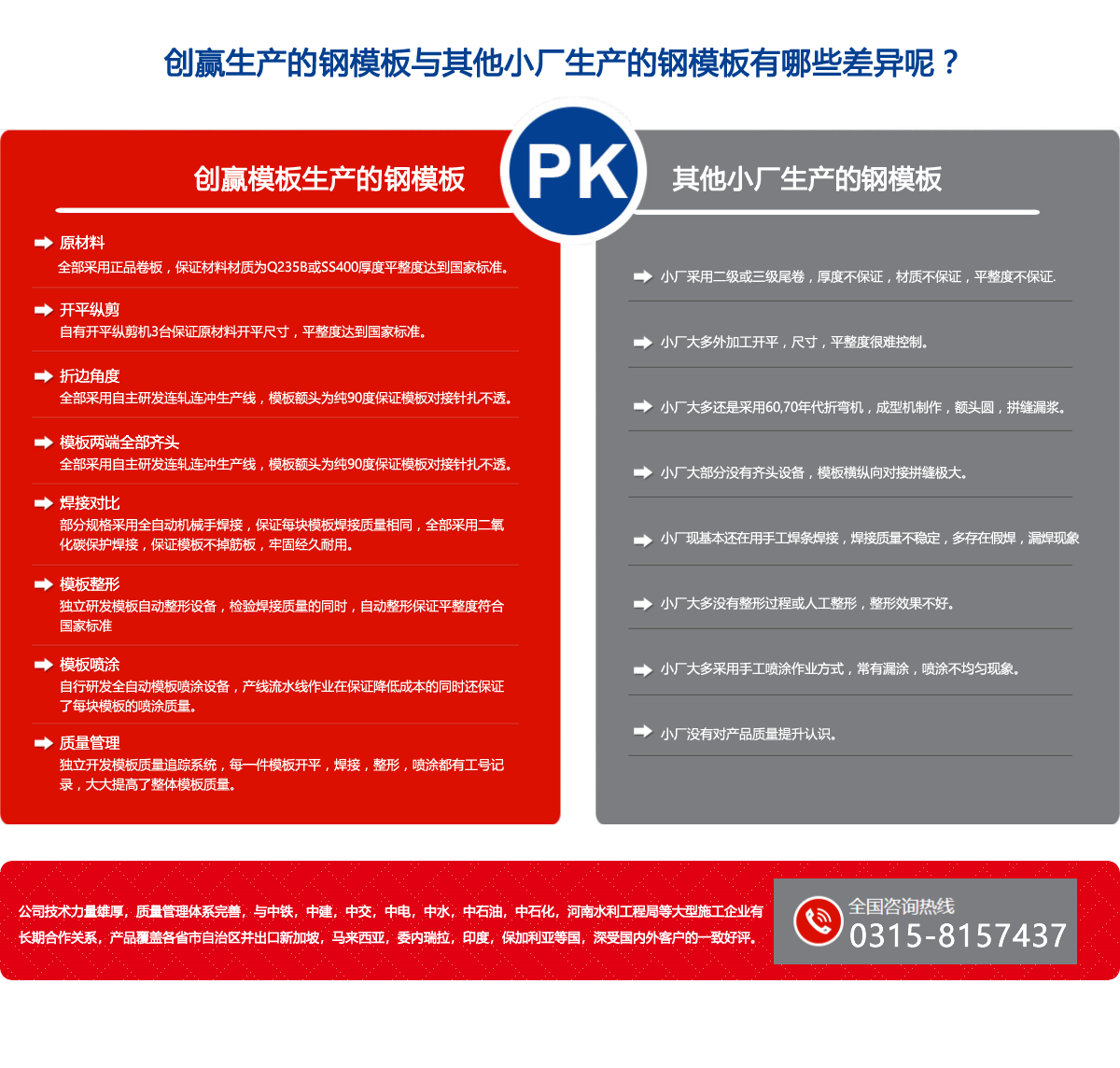 唐山創(chuàng)贏模板有限公司(原唐山豐南雙贏金屬結(jié)構(gòu)廠)始建于一九九七年,是具規(guī)模實(shí)力的組合模板生產(chǎn)企業(yè),公司自行設(shè)計(jì)制造的十二條上卷,連軋,連沖,整形,機(jī)械人焊接,調(diào)直,噴漆,打包鋼模板生產(chǎn),實(shí)現(xiàn)了自動化一條龍生產(chǎn),品質(zhì)優(yōu),效率高,規(guī)格型號為:寬度100-1200mm, 長度300-3000mm, 板厚1.8-4.0mm。 年產(chǎn)量可達(dá)200萬平方米,公司創(chuàng)新研制的輕型鋼框組合快拆鋼模板體系,是傳統(tǒng)組合小鋼模升級換代產(chǎn)品,可滿足房建,地下管廊,涵洞,公路,鐵路及各類施工企業(yè)的需要,輕型鋼框組合快拆鋼模板體系介紹及應(yīng)用,已在2017年《施工技術(shù)》雜志及《模板腳手架行業(yè)協(xié)會》雜志發(fā)表,詳情請查閱公司網(wǎng)站。 公司生產(chǎn)的噴漆鋼跳板,鍍鋅鋼跳板,采用連軋一次沖孔,承載力大,孔距均勻,外形美觀,年產(chǎn)量可達(dá)50萬塊,公司獨(dú)創(chuàng)的C型鋼生產(chǎn)線,以其產(chǎn)量高,強(qiáng)度大,成本低,交活迅速,在同行業(yè)占有較大優(yōu)勢,可與C型鋼廠家及各類施工企業(yè)合作共贏.